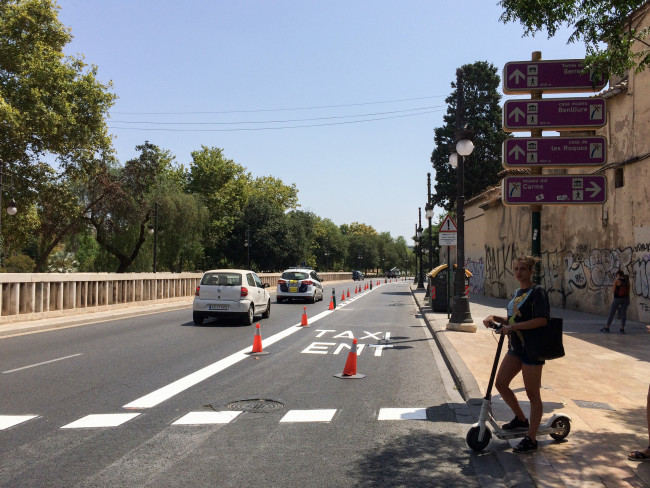 El servicio de Movilidad Sostenible del Ayuntamiento de València ha iniciado este lunes la segregación de dos tramos del carril EMT-Taxi de la marginal derecha del antiguo cauce del río Turia. El primer tramo, de casi 260 metros en la calle Blanqueria, es el comprendido entre la plaza del Portal Nou hasta la calle Pare d’Òrfens; el segundo, el comprendido entre las calles Comte de Trénor y parte de Pintor López hasta la plaza del Poeta Llorente.