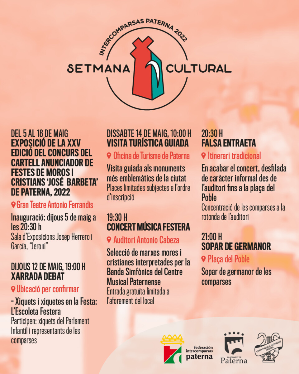 El sábado 14 de mayo, a las 10:00, la Oficina de Turismo de Paterna llevará a cabo una visita turística guiada por la ciudad. A las 19:30, pasodobles y marchas moras llenarán el Auditorio Antonio Cabeza con el concierto de música festera de la Banda Simfónica del Centro Musical Paternense.
