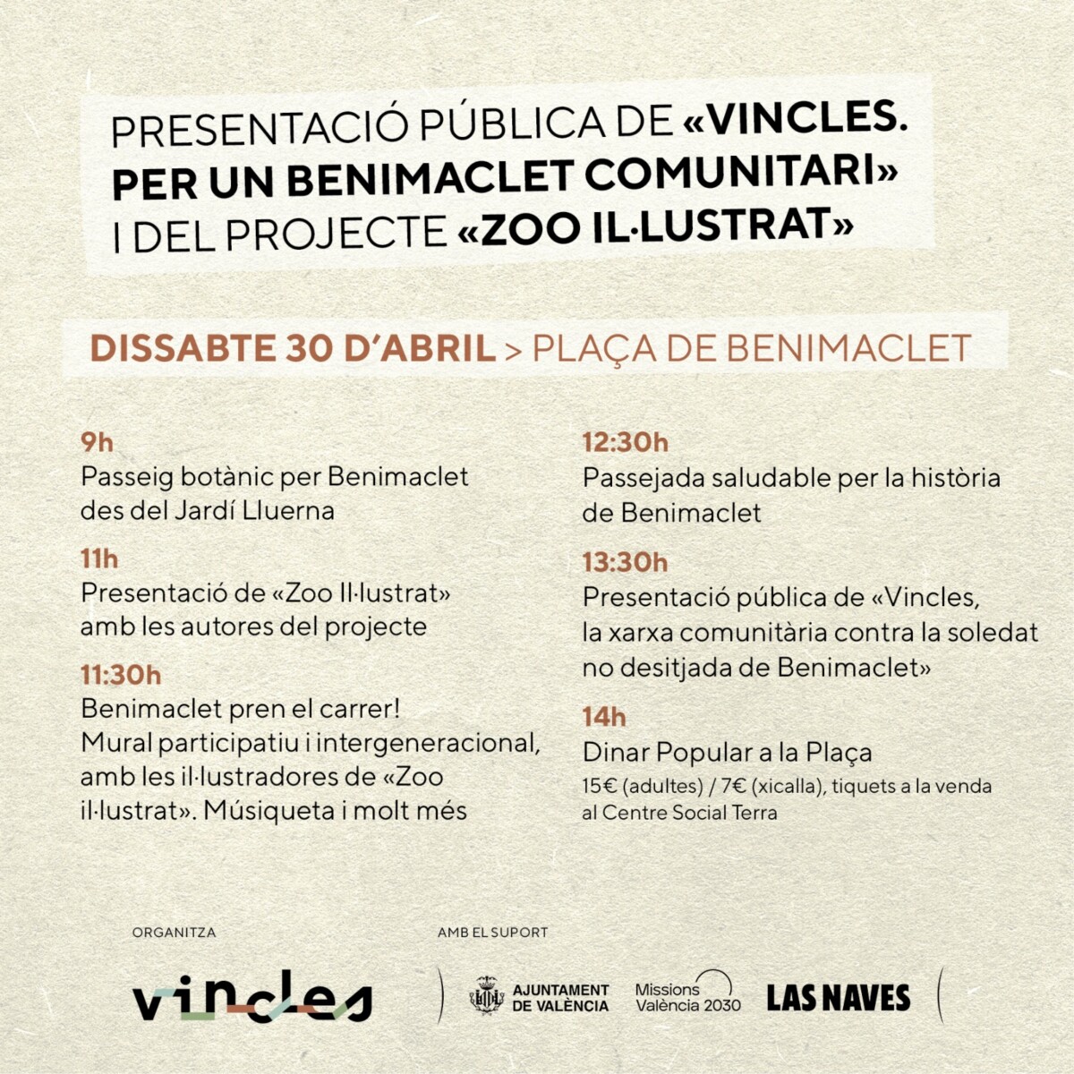 El Ayuntamiento de València presenta este sábado un proyecto que pretende la lucha activa contra la soledad no deseada, la red 'Vincles, por un Benimaclet más comunitario'. Se trata de una red de personas, entidades y servicios públicos de Benimaclet que tiene como finalidad promover las relaciones vecinales y comunitarias del barrio, contribuyendo positivamente al bienestar social.