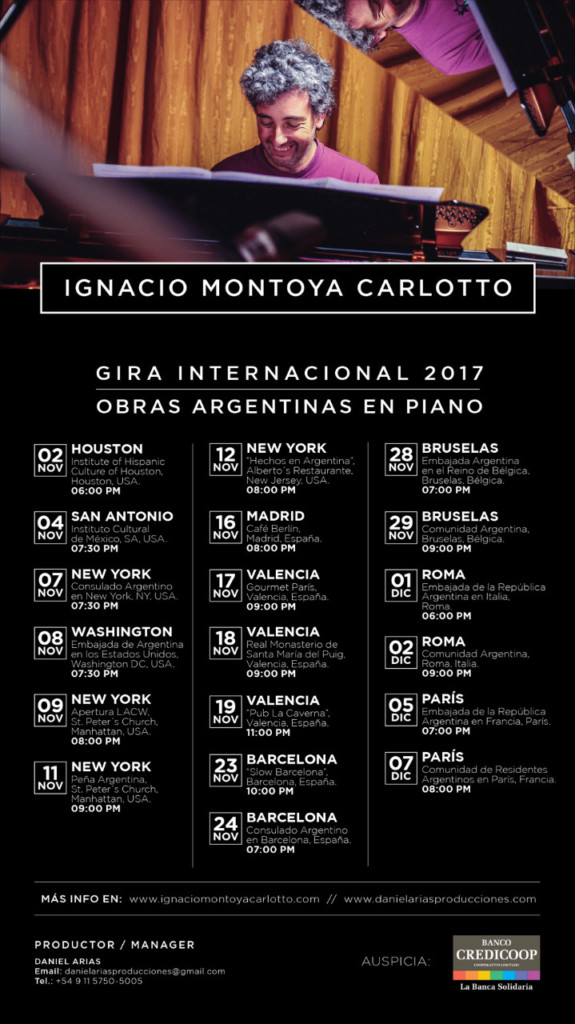Ignacio Montoya Carlotto llega a Valencia con tres funciones que tendrán lugar en ‘Gourmet París’ el día 17 (21 hs), el Real Monasterio de Santa María del Puig el día 18 (21 hs) y el Pub ‘La Caverna’ el día 19 (23 hs). Tres actuaciones para llenar de música a una ciudad con gran acogida de argentinos que arroparán la llegada de uno de los artistas populares de su país.