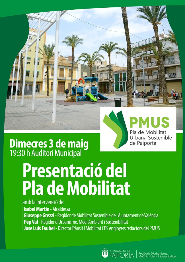 La Concejalía de Urbanismo, Medio Ambiente y Sostenibilidad ha convocado a la ciudadanía de Paiporta al acto de presentación del Plan de Movilidad Urbana Sostenible (PMUS) de la localidad, que tendrá lugar en el Auditorio Municipal este miércoles a las 19.30 horas. Este plan ha sido redactado en los últimos meses por la empresa CPS Ingenieros, con la participación de los vecinos de Paiporta, que han tenido voz en diferentes asambleas para detectar y comunicar las necesidades de mejora de la movilidad y la accesibilidad de las calles del pueblo.