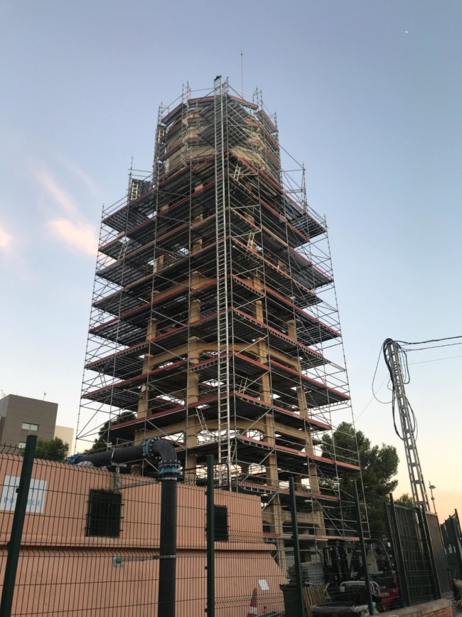 Respecto a las obras, que tiene una duración prevista de 4 meses y una inversión cercana a los 100.000 euros, Campos ha explicado que, entre otras cosas, se va a proceder a la retirada de las viejas tuberías de fibrocemento de llenado y vaciado, se ha instalado un andamio perimetral que permite el acceso seguro a cualquier punto de la estructura hasta una altura de 30 metros sobre el suelo y se va a desmontar la antigua escalera de acceso.