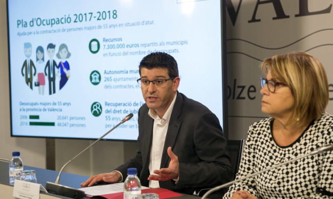 La Diputació de València ha presentado hoy su nuevo Plan de Empleo con el que pretende repartir 7,3 millones de euros entre 260 municipios de la provincia entre lo que queda de 2017 y 2018 para la contratación de, en total, un millar de personas con especial incidencia en el colectivo de mayores de 55 años.