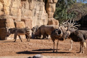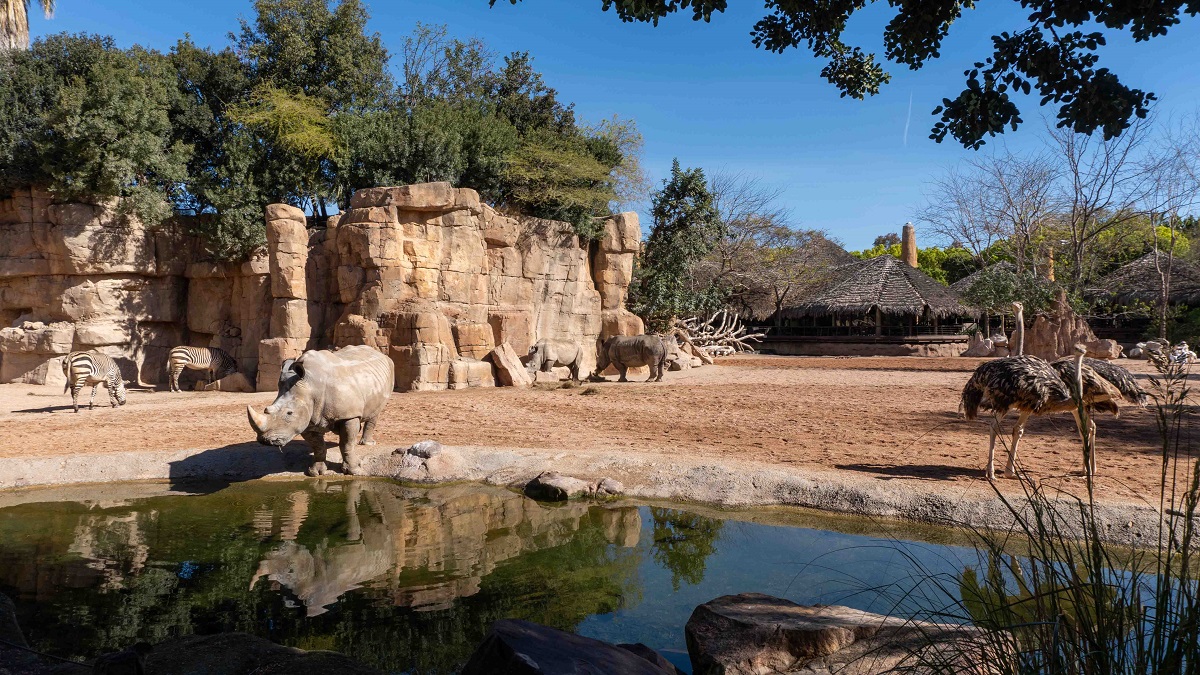 En Bioparc podemos admirar este impresionante animal en un recinto multiespecie realmente extraordinario, en la zona que recrea la sabana. Junto a los cuatro rinocerontes se encuentran otras especies igualmente incluidas en proyectos de preservación: el avestruz de cuello rojo (Struthio camelus camelus), en peligro crítico de extinción con una estimación de inferior a 1.000 individuos; la cebra de Hartmann (Equus zebra hartmannae), también en una situación vulnerable; y diversas aves muy singulares como el marabú (Leptoptilos crumeniferus), el pelícano (Pelecanus onocrotalus) y el ibis sagrado (Threskiornis aethiopicus).