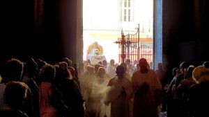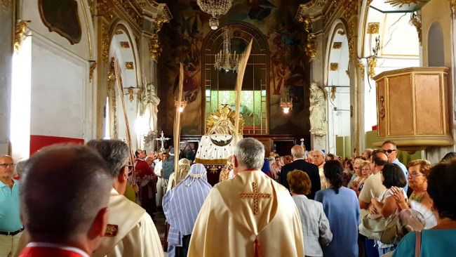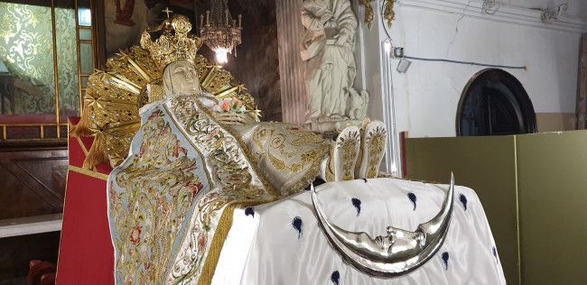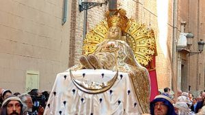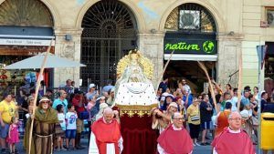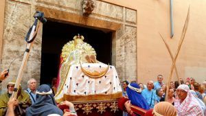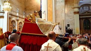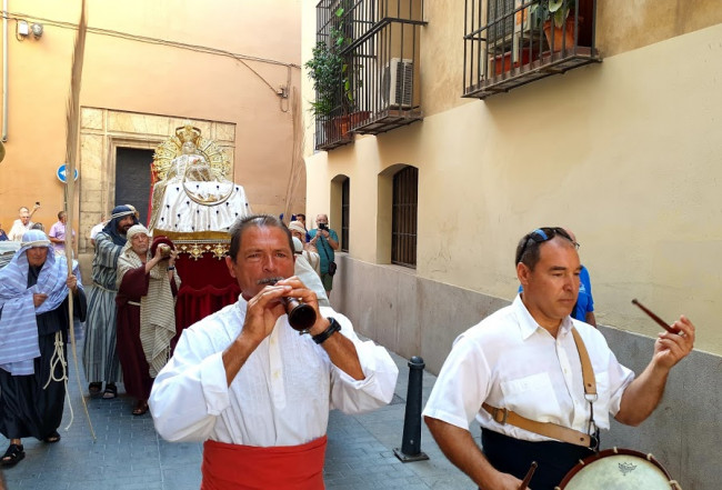 Una vez finalizada en la Catedral la celebración por los canónigos de las Vísperas en la Solemnidad de la Asunción de la Virgen a las 18.30 horas, comenzó la procesión con el sonido de fondo del volteo a mano de la campanas de la Catedral, del “tabalet y dolçaina”, y la banda del Centro estudio Musical “Almàssera”.