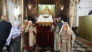 La procesión con la imagen yacente de la Dormición de la Virgen, portada por el “Grup de Mecha” cuyos miembros estaban caracterizados como los doce apóstoles, iba acompañada por 14 canónigos y, tras ellos, concejales del Ayuntamiento de Valencia, y recorrió el trayecto desde la Catedral, por la plaza de la Reina y la calle del Mar, hasta la Iglesia del Milagro, en donde se venera todo el año. Se trata de la procesión más antigua de Valencia, ya que data del año 1352.