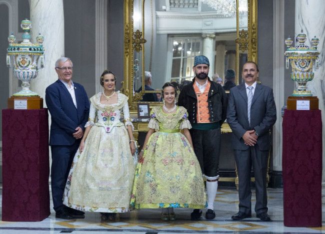 Se desplazaba todo el mundo, tras el Himno de Valencia, al contiguo Salón del Cristal, donde como es costumbre, se les entregaba a las Falleras Mayores de Valencia el primer regalo de todos los que van a recibir en su año de reinado: los ya tradicionales Alfabeguers de cerámica, obra del artista valenciano de Alzira, Xavier Claur.