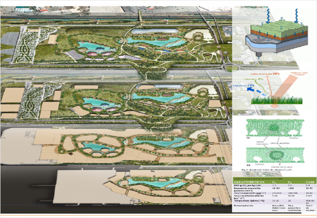 “Ejemplo de los estudios técnicos en torno al paisajismo de las cubiertas verdes son los que se están realizando para la selección de especies de alta fijación del CO2 en plantas con metabolismo fotosintético C4 (metabolismo fotosintético del ácido dicarboxílico) y CAM (metabolismo ácido de Crasuláceas, Crassulacean Acid Metabolism). La combinación de ambas permitiría una alta fijación de CO2 tanto durante el día como durante la noche”, explican los promotores.
