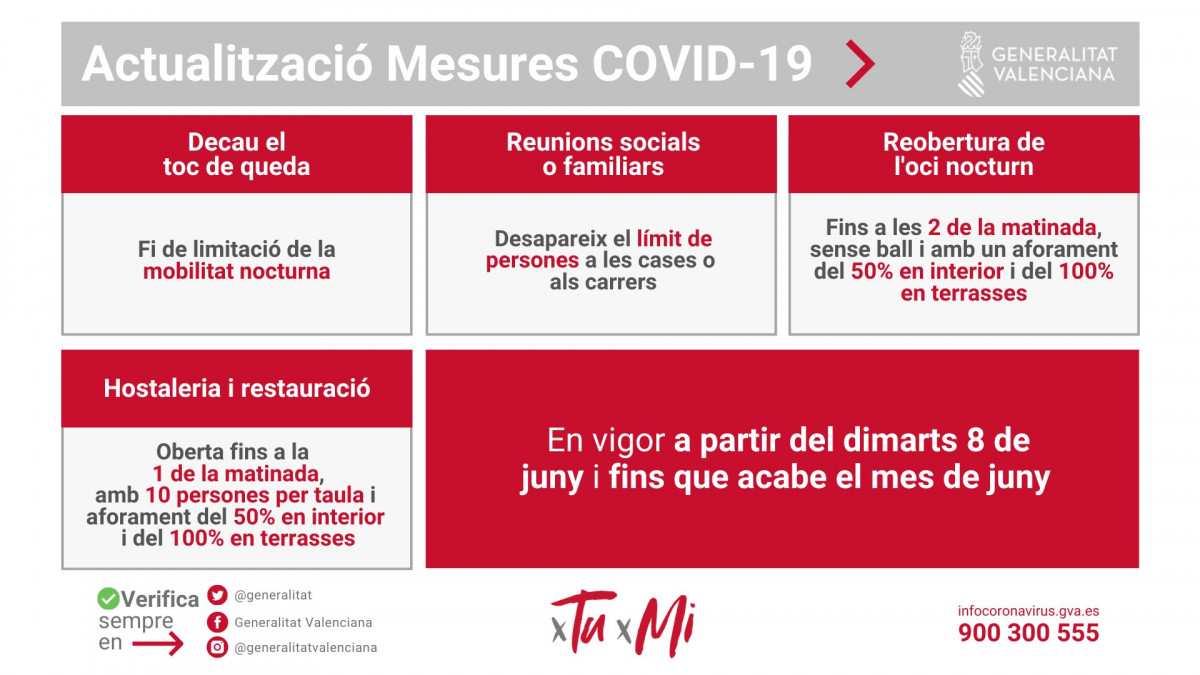 El President de la Generalitat, Ximo Puig, ha anunciado este jueves, tras la reunión Interdepartamental de la Generalitat para la Prevención y Actuación ante la Covid-19 celebrada esta mañana, que la Comunitat Valenciana levantará la limitación de la movilidad nocturna -el famoso toque de queda- a partir del próximo martes, 8 de junio.