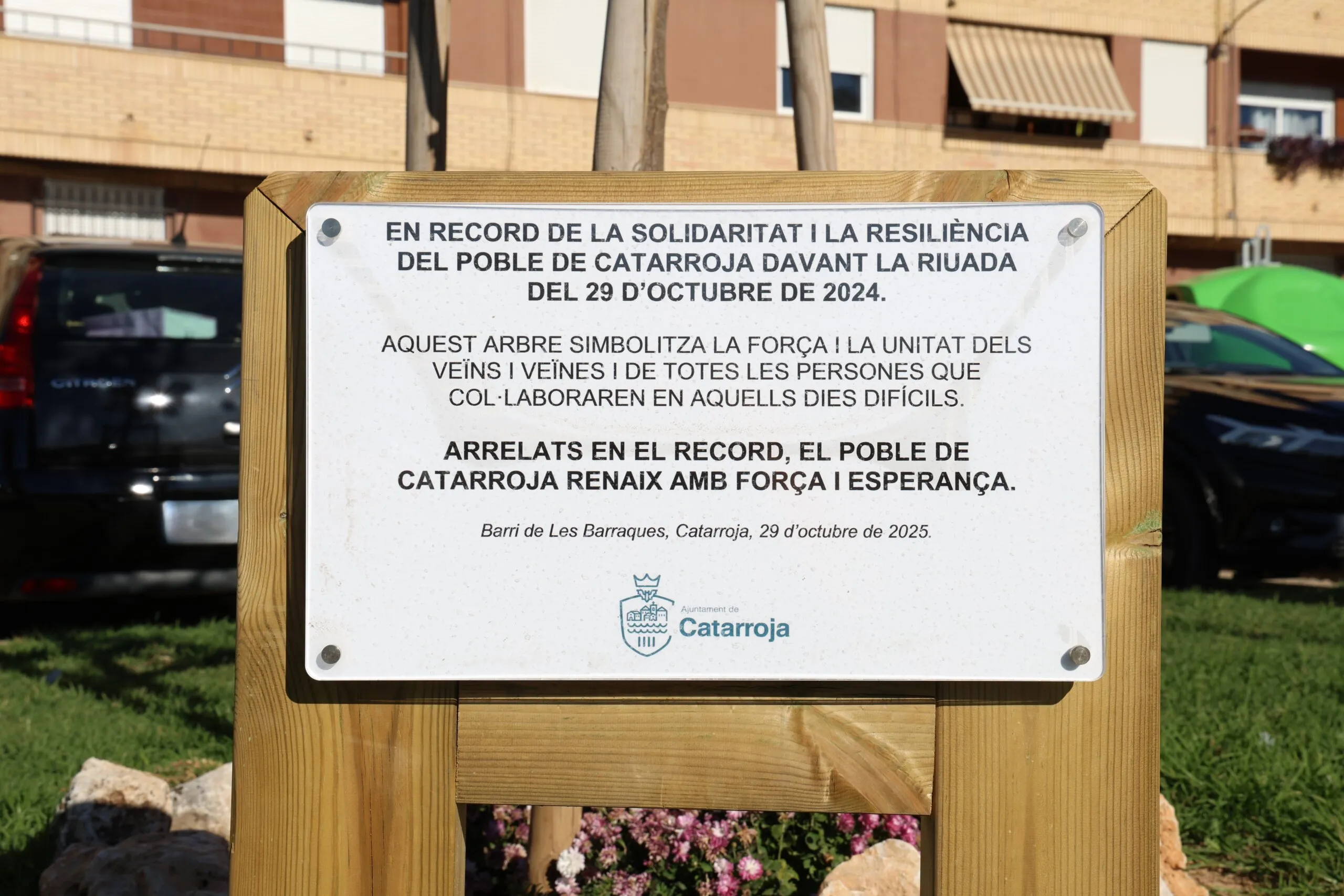 En el espacio se ubica también una placa conmemorativa "en recuerdo de la solidaridad y la resiliencia del pueblo de Catarroja ante la riada del 29 de octubre de 2024".