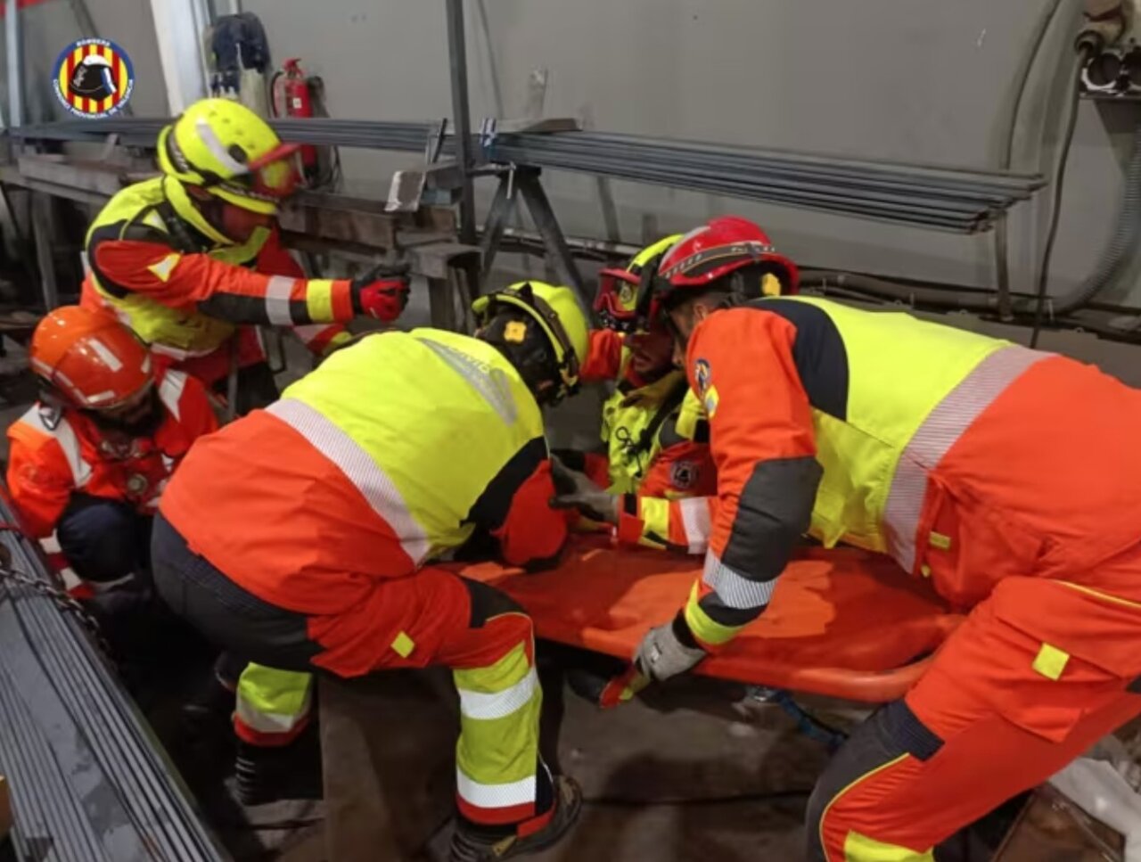 Efectivos del Consorcio Provincial de Bomberos de Valencia han rescatado en la mañana del miércoles 14 de noviembre a un operario que había quedado atrapado por la pierna bajo una carga de perfiles metálicos.