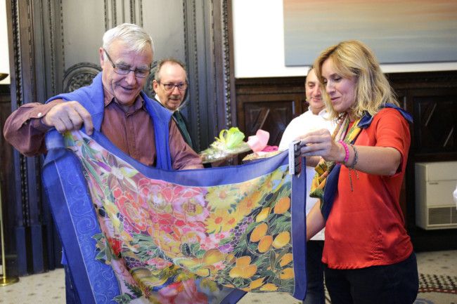 El alcalde de Valencia ha recibido hoy la tradicional Mocadorà con motivo de Sant Donís. Representantes del Gremio de Maestros Confiteros de València y del Gremio de Panaderos y Pasteleros de València se han acercado hoy al Ayuntamiento para entregarle la tradicional Mocadorà al alcalde de València, Joan Ribó “Agradezco el obsequio que hacen al Ayuntamiento en forma de Mocadorà, es una visita que recibo con mucha alegría”, ha señalado el alcalde.