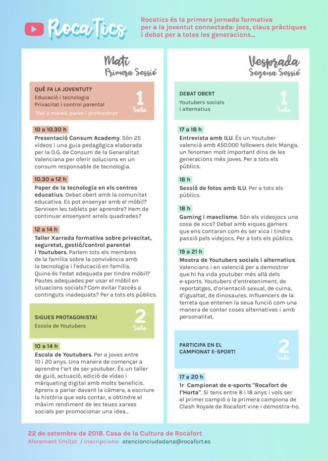 La Casa de Cultura de Rocafort acoge este sábado 22 de septiembre la primera edición de RocaTICs, una jornada pionera en l’Horta Nord dedicada a jóvenes, youtubers e internet. La iniciativa, que nace desde la unidad de Promoción Lingüística del Ayuntamiento, está dirigida a jóvenes, docentes, padres y madres para ofrecer herramientas con las que interpretar la ‘invasión’ tecnológica contemporánea y cómo afecta a los jóvenes, abrir un debate social pedagógico sobre este fenómeno, así como hacer visible el uso del valenciano en la red.