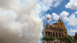 A continuación se disparó una mascletà que se hizo sentir prácticamente por toda la ciudad. Unas cintas con los colores de los dominicos predicadores, blanco y negro, eran lanzadas al viento para terminar engalanando la propia estatua del Santo.