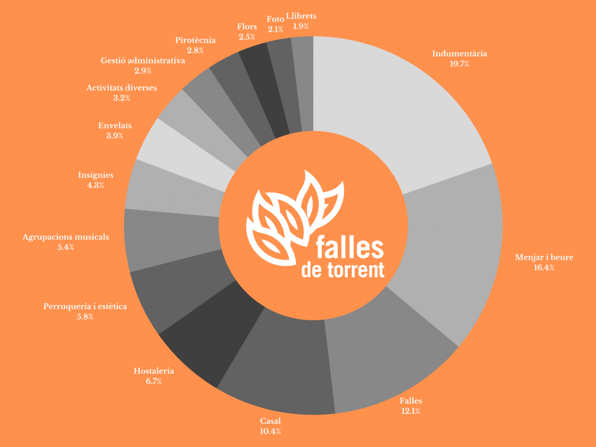 Así el primer sector en gasto directo es el de la indumentaria, con un impacto de 609.000 € (el 19,7% del total) que sale directamente del bolsillo de los falleros, el segundo sector en importancia es el de comida y bebida en los casales durante todo un ejercicio, con una estimación de 508.000 €, seguida de lo presupuestado en el monumento que en el ejercicio 2020 era de 375.000 € (entre fallas grandes e infantiles). El resto de impacto económico que generan las comisiones de Torrent viene determinado por el uso y mantenimiento del casal (alquiler, hipotecas, etc.) con 320.000 €.