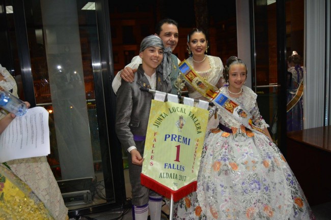 La comisión de Sant Vicent ha recogido hoy en el balcón del Ayuntamiento de Aldaia el 'palet' que la acredita como mejor falla del municipio en este 2017. El primer premio en el monumento grande, el de mejor crítica y el tercer premio en fallas infantiles culminan un galardonado año para esta falla aldaiera.