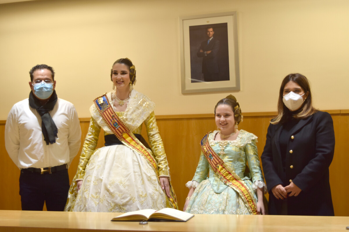 Concluida la Crida, las Falleras Mayores Alicia Pérez y Lucía López accedieron al salón de Plenos del ayuntamiento, donde les esperaban el alcalde José Francisco Cabanes y la concejala Beatriz Cuesta, para que ambas falleras firmaran en el Libro de Oro de la Cultura del municipio.