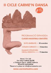 Desde el 8 de noviembre y hasta el 19 de enero de 2020, Carme Teatre presentará un total de 9 espectáculos creados por mujeres coreógrafas provenientes de València, Cataluña, Baleares, Madrid, Canarias, Extremadura, Israel, Francia y Brasil.