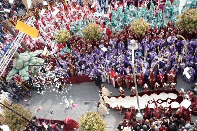 Llegaba el Domingo de Resurrección y las hermandades, repartidas en dos grupos, desfilaban desde la parroquia de Monte-Sión y desde la parroquia de la Asunción, acompañando a las imágenes de la Virgen y Cristo Resucitado, respectivamente, para terminar concentrándose en la plaza Mayor.