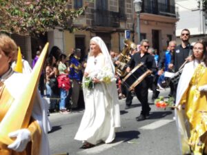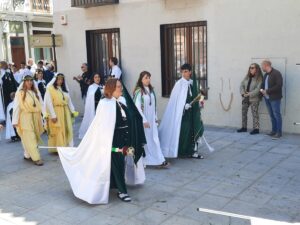 Los báculos de los cofrades van coronados con pequeños ramos de flores y los personajes bíblicos abandonan su silencio y recogimiento de días anteriores y sonríen a la Resurrección regalando flores a diestro y siniestro. La música también se transforma dejando atrás el ritmo cadencioso, trágico y fúnebre de la Pasión para dar paso a la alegría del momento.