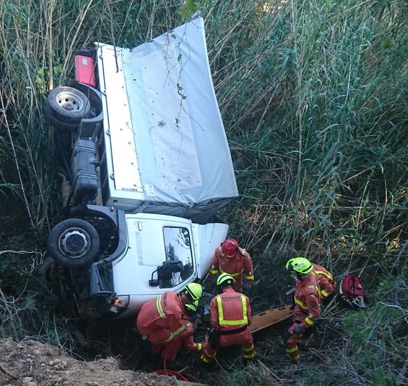 Los bomberos rescatan a la conductora de un camión que quedó atrapada tras caer a un barranco en Picassent