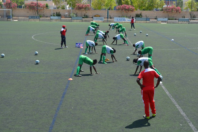 Las selecciones femeninas de fútbol de Kenia y Venezuela entrenan en las instalaciones del polideportivo de Benetússer