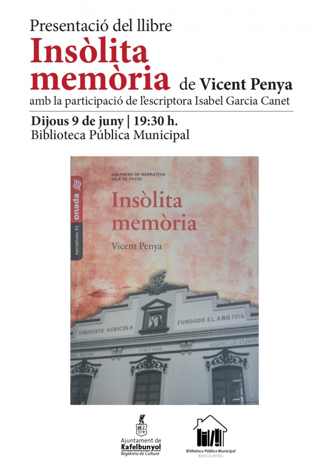 El acto de presentación de ‘Insólita Memòria’, de Vicent Penya, reabrirá la biblioteca municipal de Rafelbunyol