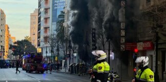 Los bomberos trabajan sin descanso para extinguir el incendio en un bingo en el centro de Valencia