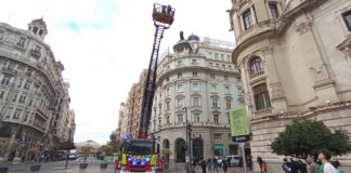 Bomberos inspeccionan fachadas de la Plaza del Ayuntamiento de Valencia para garantizar la seguridad en las mascletaes