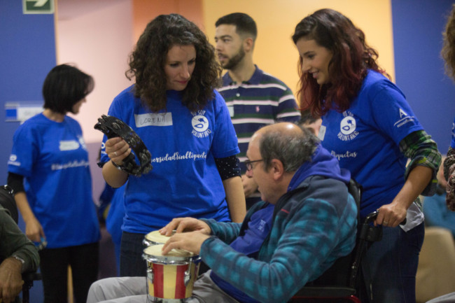 Voluntarios de Global Omnium participan en un taller de musicoterapia con personas con parálisis crerebral