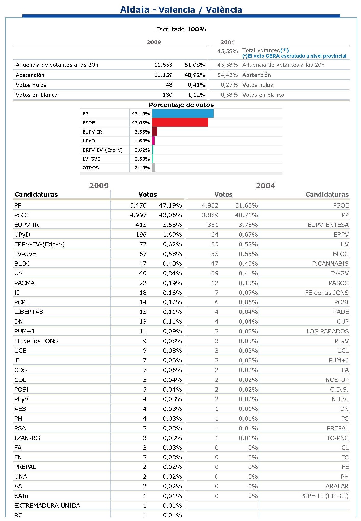 Elecciones Europeas 2009. Resultados en Aldaia