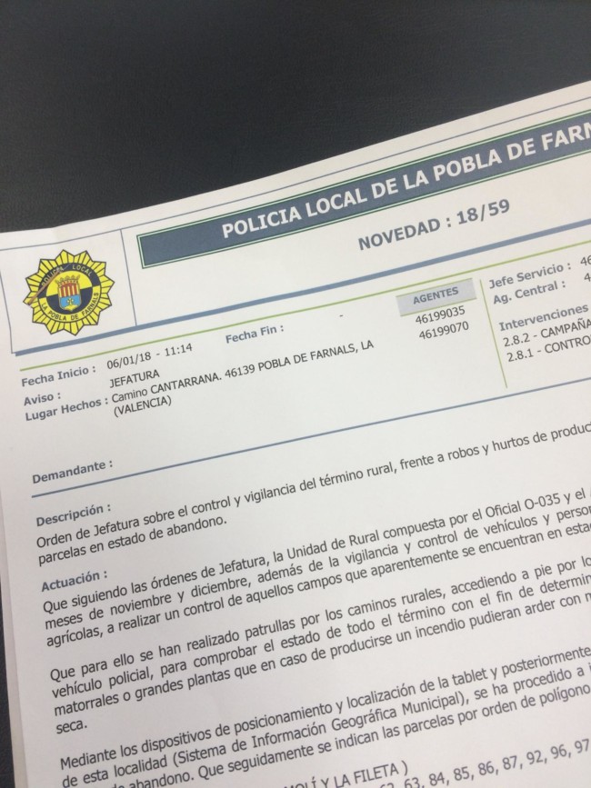 La Unitat de Vigilància Rural realitza un inventari dels terrenys abandonats de la Pobla de Farnals