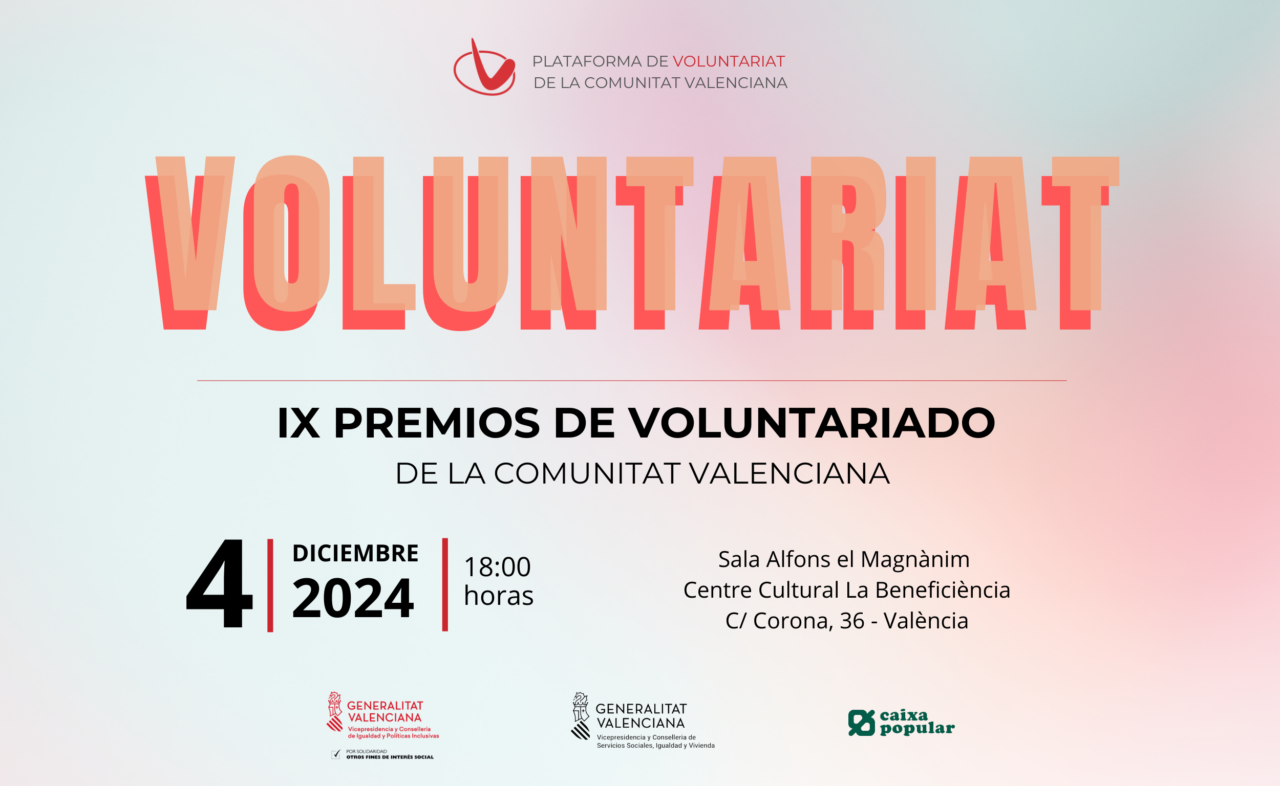 La IX Gala de Premios del Voluntariado 2024 del 4 de diciembre reconocerá el trabajo solidario de la Comunitat