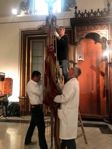 Técnicos de una empresa especializada en el transporte de obras de arte han tomado hoy medidas a la réplica de la Real Senyera expuesta en el Museo Histórico Municipal.