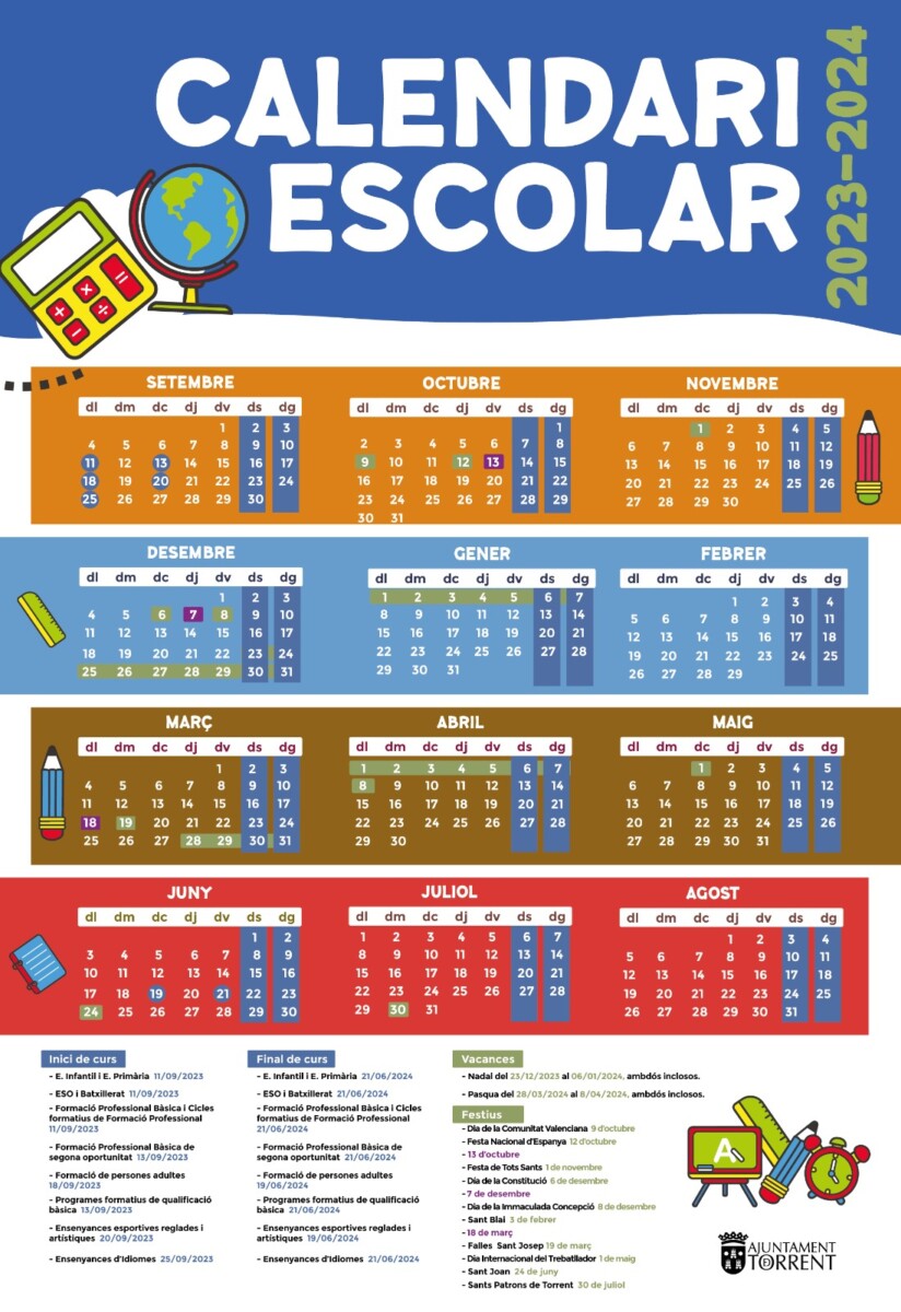 Con septiembre acercándose, los centros educativos de la ciudad se están preparando para reanudar sus actividades después del merecido descanso durante el verano. El área de Educación del ayuntamiento de Torrent ha dado a conocer el calendario escolar para el curso 2023/24, que comenzará el próximo 11 de septiembre y finalizará el 21 de junio de 2024 para los niveles de Infantil, Primaria, ESO, Bachillerato y Formación Profesional Básica, así como los Ciclos Formativos de FP.