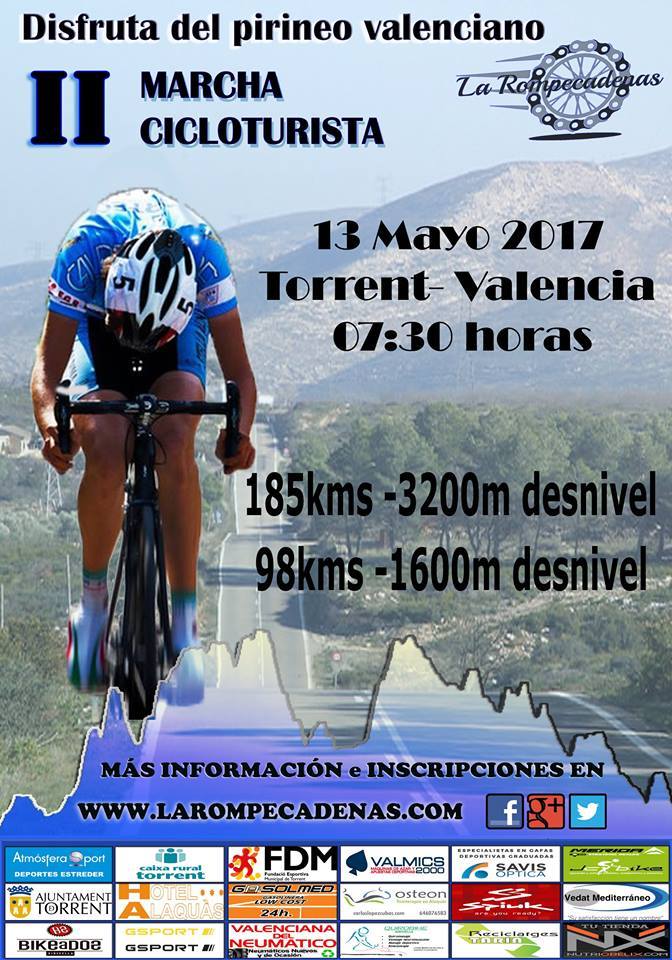 Además, el sábado 13 de mayo la capital de l’Horta Sud acoge la II Marcha cicloturista La Rompecadenas de Torrent. Una cita deportiva organizada por el Club Ciclista del municipio abierta a todos los ciclistas federados y no federados mayores de 18 años para realizar el recorrido largo y corto (Gran y Medio Fondo), 185 kilómetros y 3.200 metros de desnivel y 98 kilómetros y 1.600 metros de desnivel respectivamente.