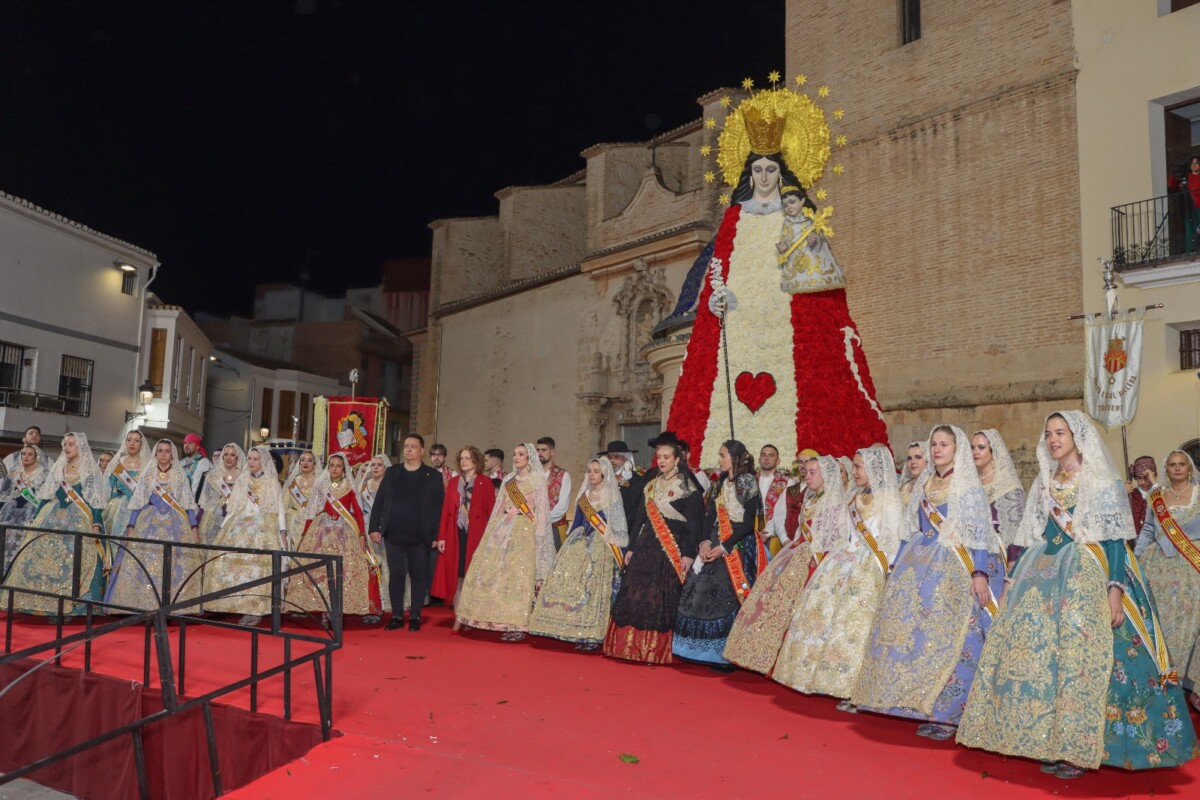 Tras la entrega de sus ramos y a los pies de la Virgen ofrecían sus plegarias y el himno de Torrent para cerrar la ofrenda 2024, que un año más se ha celebrado en una sola fecha.
