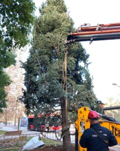 El servicio de Parques y Jardines del Ayuntamiento de Valencia ha trasplantado este martes por la mañana el árbol de Navidad situado durante todas las fiestas en la plaza de la Reina, que ahora se encuentra en la calle Dr. Tomás Sala, 8 (bulevar sur frente al barrio de San Marcelino).