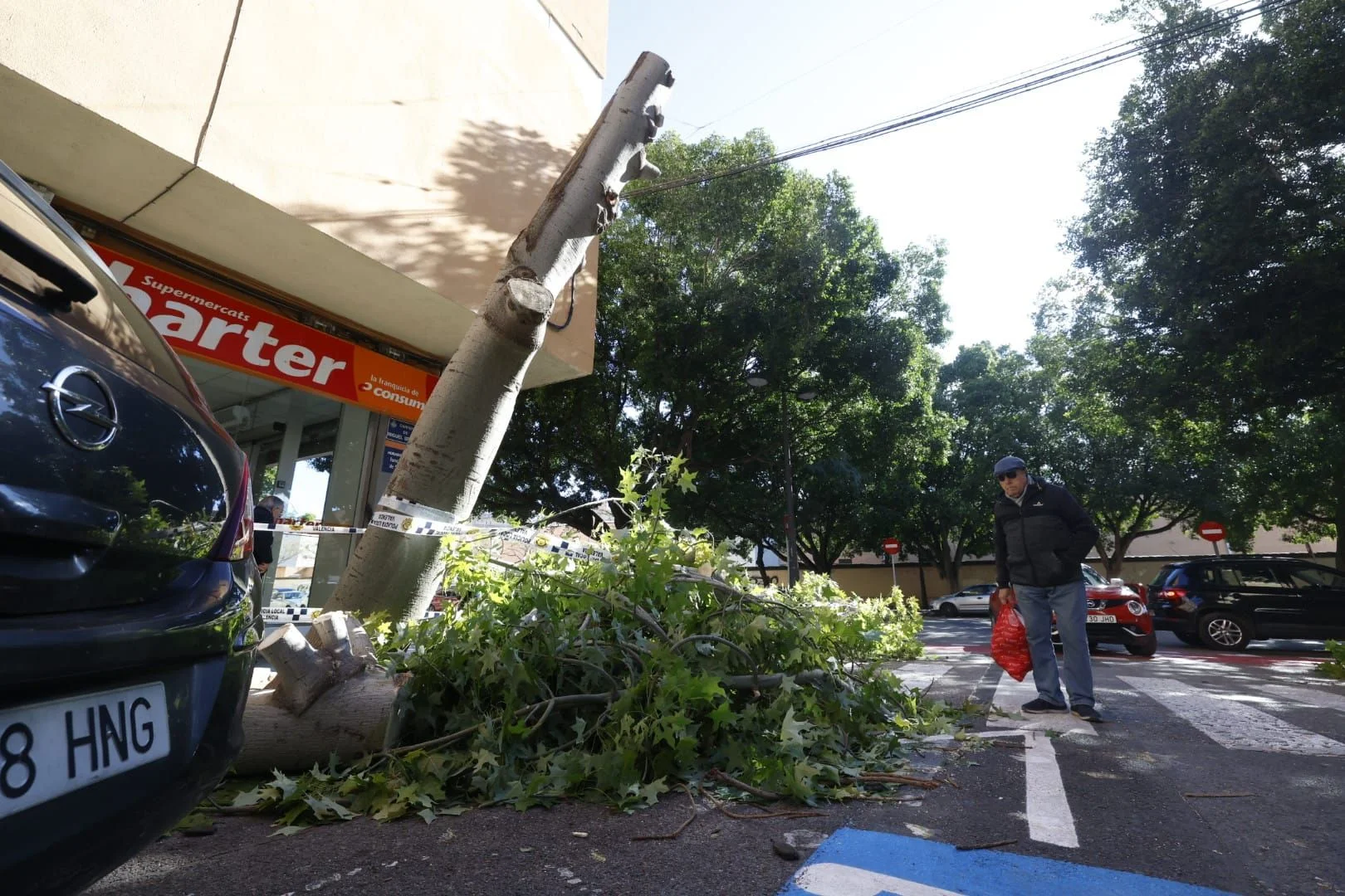 Efectivos de mantenimiento y seguridad se han desplazado al parque para proceder al troceo del ejemplar y su posterior retirada. Como medida de prevención, el Ayuntamiento ha decidido clausurar y precintar el acceso al parque y otras zonas ajardinadas de Catarroja, ante el riesgo de que otros árboles puedan sufrir daños similares por la fatiga del viento.