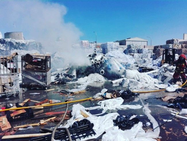 Un total de seis dotaciones del Consorcio Provincial de Bomberos han acudido a la llamada de un incendio en una empresa de reciclaje ubicada en el polígono de Fuente del Jarro de Paterna.