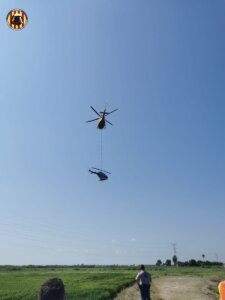 El helicóptero del Consorcio ha trasladado al accidentado a zona segura para evitar vertidos, tanto del material de fumigación como del combustible de la máquina.
