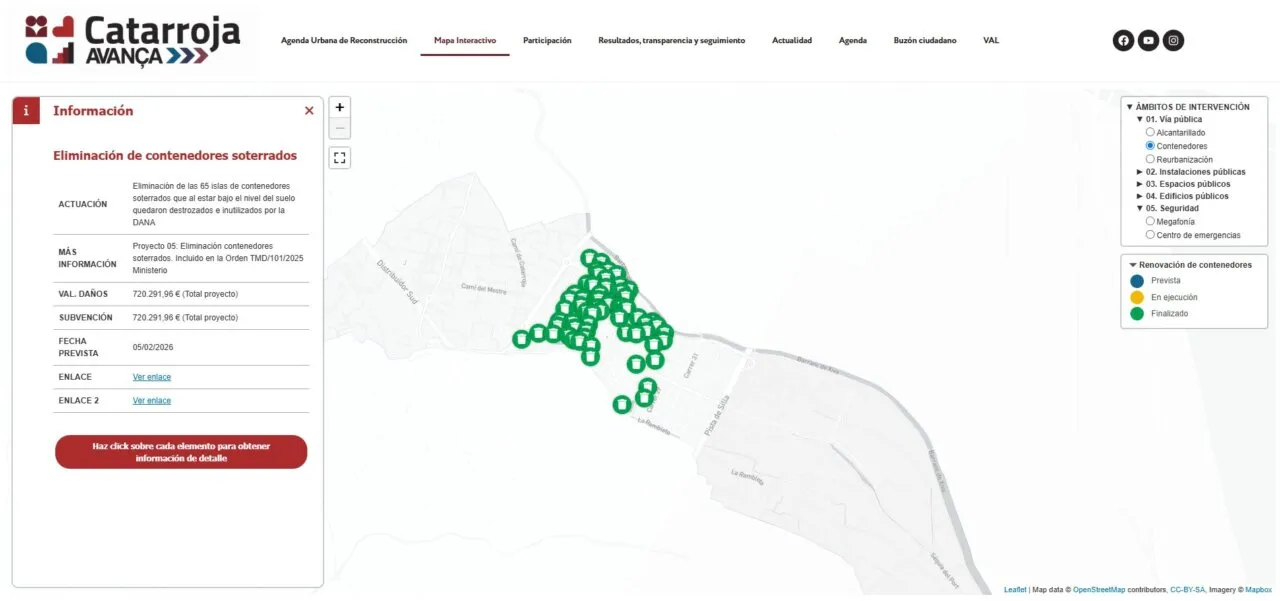 L’Ajuntament de Catarroja ha posat en marxa un mapa interactiu de consulta pública dins de la web Catarroja Avança. Esta ferramenta permet a la ciutadania seguir de manera clara, accessible i transparent l’avanç de totes les obres vinculades a l’Agenda Urbana de Reconstrucció.