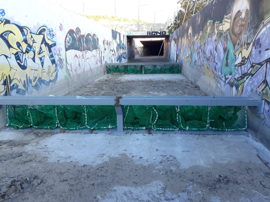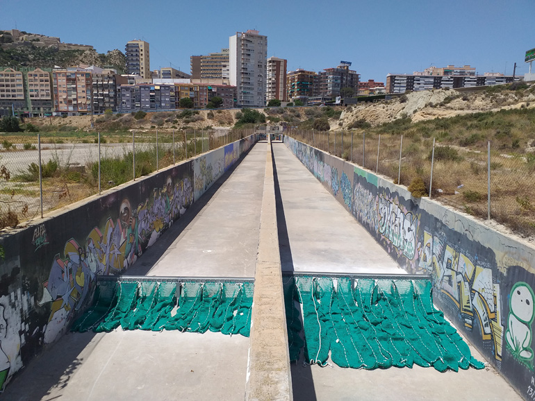 Hace unos meses se realizaron, con la colaboración del Ayuntamiento de Alicante, las primeras pruebas de este sistema con la instalación de 16 redes de diferentes tamaños. A día de hoy y tras realizar varios pilotos en las lluvias acontecidas en la ciudad en los meses de agosto y septiembre, ya se cuenta con un total de 32 redes distribuidas en dos filas y con una longitud de 2 metros cada una para facilitar su manipulación en las labores de limpieza. En total, cada una de estas redes son capaces de retener 800 kilogramos de residuos sólidos de dimensiones superiores a los 4 centímetros. Por lo que la capacidad de retención de todas las redes instaladas se acerca a las 30 Tn.