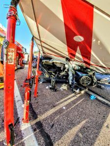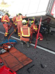Como consecuencia de una colisión múltiple, el turismo ha terminado quedando debajo del camión, que ha volcado sobre él. El conductor del turismo ha quedado atrapado dentro del vehículo y ha tenido que ser excarcelado por efectivos del Consorcio Provincial de Bomberos de València. Han actuado en estas labores tres dotaciones procedentes de los parques de Paterna y Burjassot.