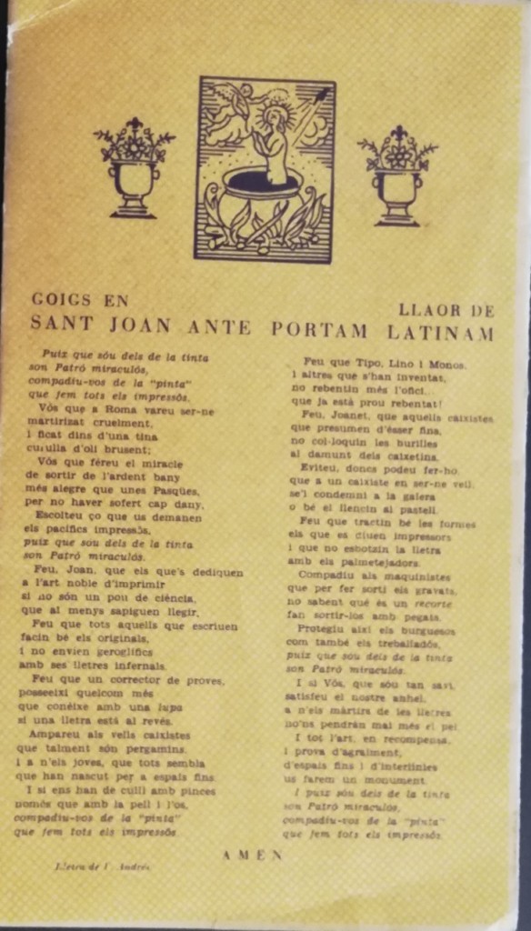 Amb motiu de la festivitat del patró de les Arts Gràfiques van organitzar una excursió a la histórica ciutat de Xàtiva, amb eixida amb autobús des de la propia empresa. Només arribar estava previst participar en una trovada futbolística en un equip local. Després visitarien el Castell i la Paperera de Sant Jordi, reposant forces en el restaurant de l’hotel El Españoleto. Esta seria la sexta excursió, per a la que van imprimir un triptic anunciador, desplegable i encunyat, amb fotografíes de Xàtiva, incloent un poema obra de Vicent Garcerà. Un altre autor que va col·laborar en el dit imprés va ser V. Andrés (tinc el dubte si seria el propi poeta Vicent Andrés Estellés) així firme en els divertits gojos que figuren en la part posterior de l’imprés. Estan dedicats en Llaor de Sant Joan ante portam latinam. Són curiosos els seus versos dedicats a la impremta, els impressors, passant per elements com el paper i la tinta.