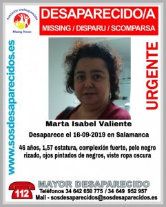 La mujer, de 46 años de edad, mide aproximadamente 1.57 m. de altura, es de complexión fuerte, pelo rizado negro, viste ropa oscura y su nota más característica es que lleva los labios pintados de negro, "se notan mucho", indican los hijos. Se llama Marta Isabel Valiente Carpio y padece una enfermedad de índole psiquiátrica por lo que no está en plenas facultades.