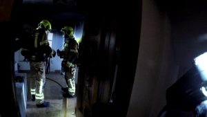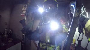 Los bomberos aseguraban el inmueble, y procedían a ventilar la vivienda y la escalera.