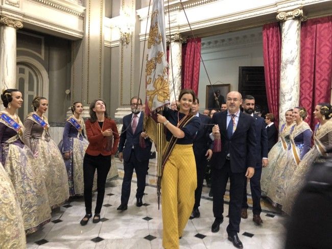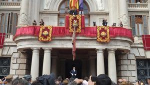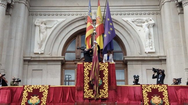 La Procesión Cívica del 9 d'Octubre ha partido de la plaza del AYuntamiento, donde se ha vividpo otro momento significativo y emocionante, el de la bajada de la Senyera por el balcón de la casa consistorial para no inclinarse.