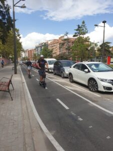 El nuevo carril bidireccional circula por la vía de servicio de avenida del Cid dirección centro, y pasa al lateral norte de la calzada a la altura de la calle Totana. Una vez finalice la obra al completo, el reparto viario a partir de San José de Calasanz será de dos carriles para el tráfico motorizado, dos para las bicicletas y vehículos de movilidad personal -uno por sentido-, y uno más segregado para el uso exclusivo de EMT y taxi. Además, la conclusión de la obra permitirá una mejora de los itinerarios peatonales al crearse un nuevo paso a la altura de la plaza del Obispo Amigó, y con la ampliación de aceras y espacios estanciales para los transeúntes.
