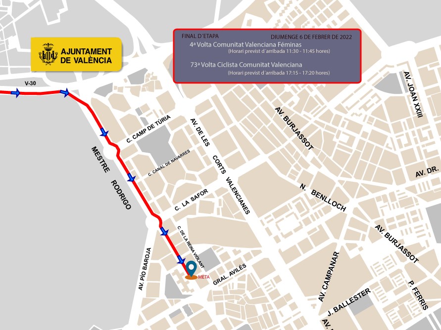 València acogerá este próximo domingo, 6 de febrero, la última etapa de la Volta Ciclista a la Comunitat Valenciana, que llegará a la ciudad por la CV30 y tiene la meta en la avenida Maestro Rodrigo, entre las calles La Safor y General Avilés.